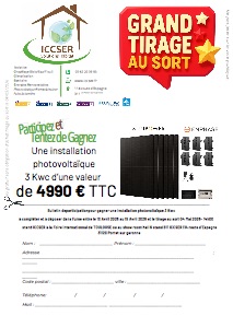 Le bulletin gagnant est considéré comme une remise de 4990€ TTC à valoir sur l’acquisition d’une installation photovoltaique de 3 Kwc minimum auprès de ICCSER solutions Habitat 114 route d’espagne 31120 Portet sur garonne
